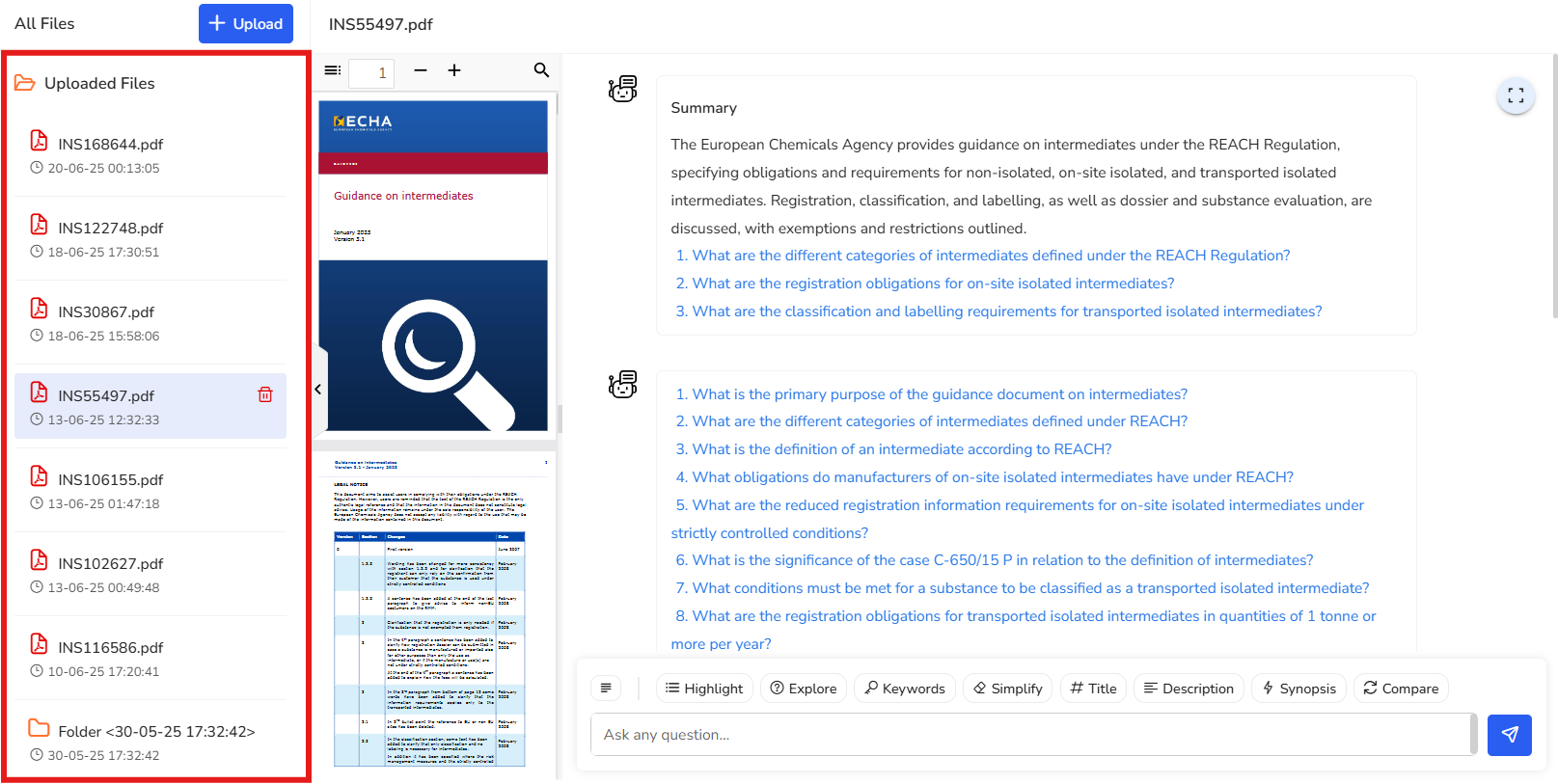 • As soon as your document is uploaded, you’ll receive a concise summary of its key points—making it easy to grasp the content at a glance. To help you get started, suggested questions are provided, or you can ask your own questions. The more specific your questions, the more accurate and relevant your answers will be.