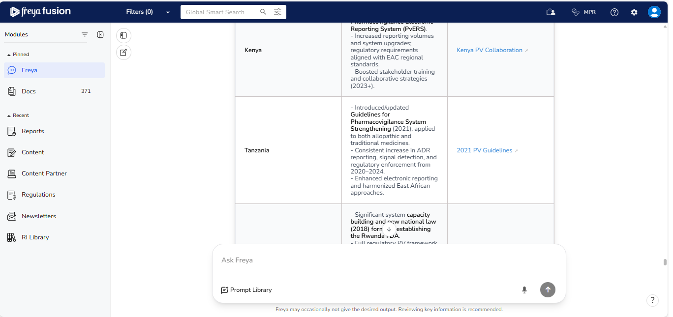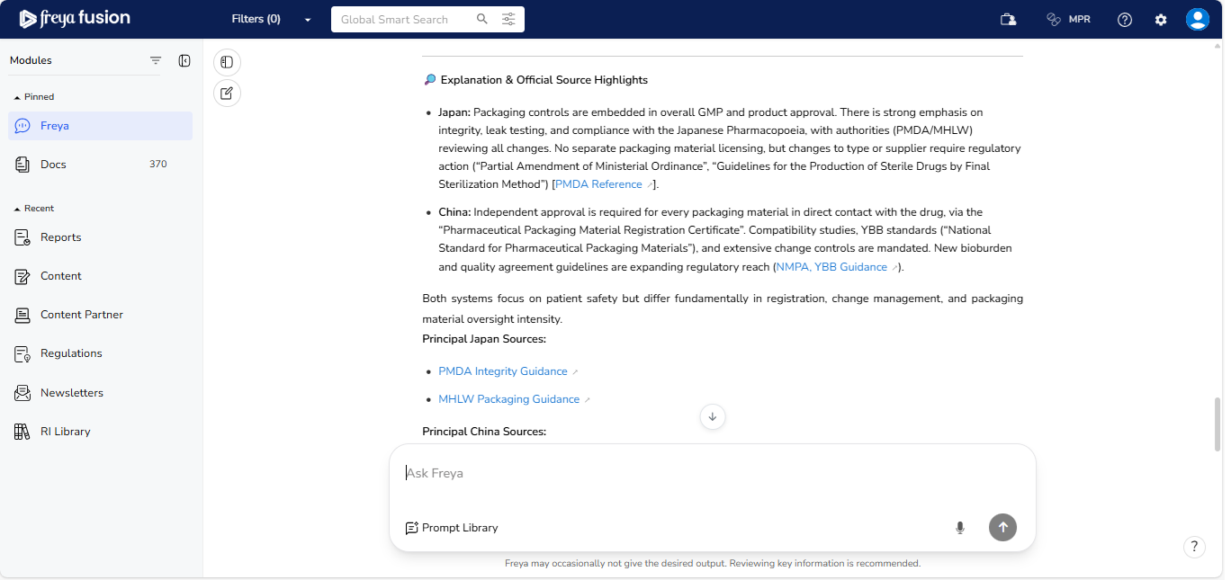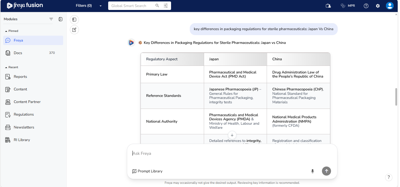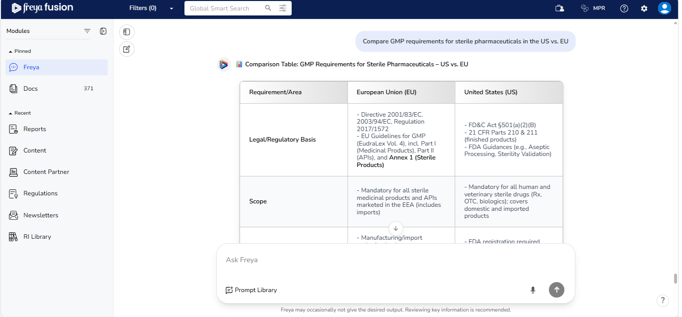 Freya 2.x is designed to help you navigate regulatory complexity with speed and confidence. Whether you're researching a specific requirement or exploring cross market comparisons, Freya delivers structured and reference backed insights.