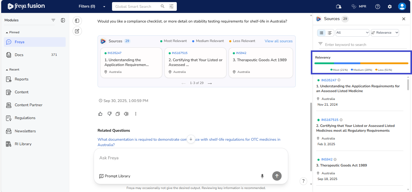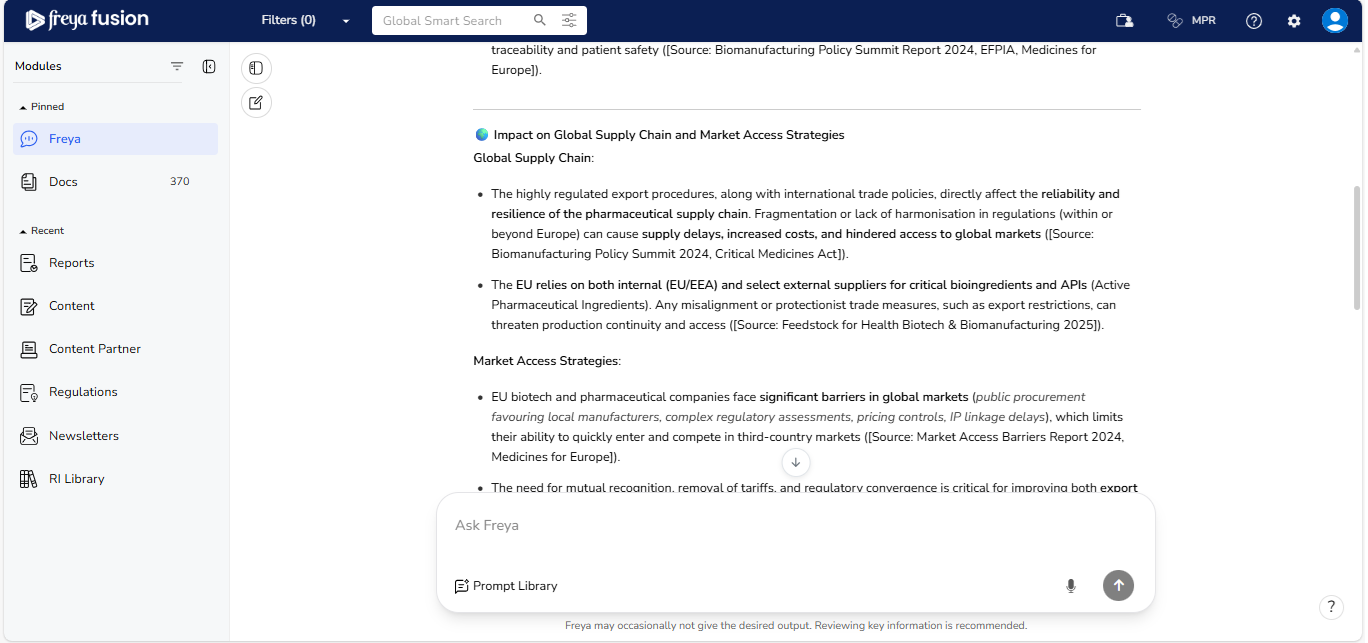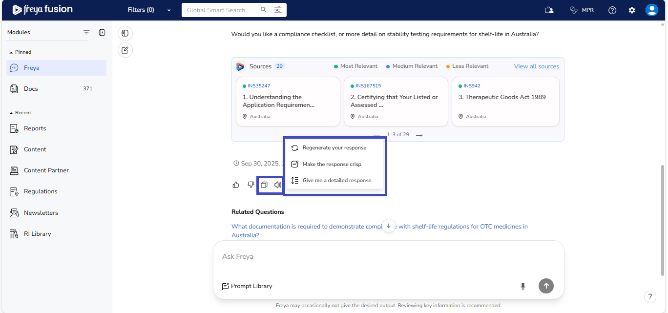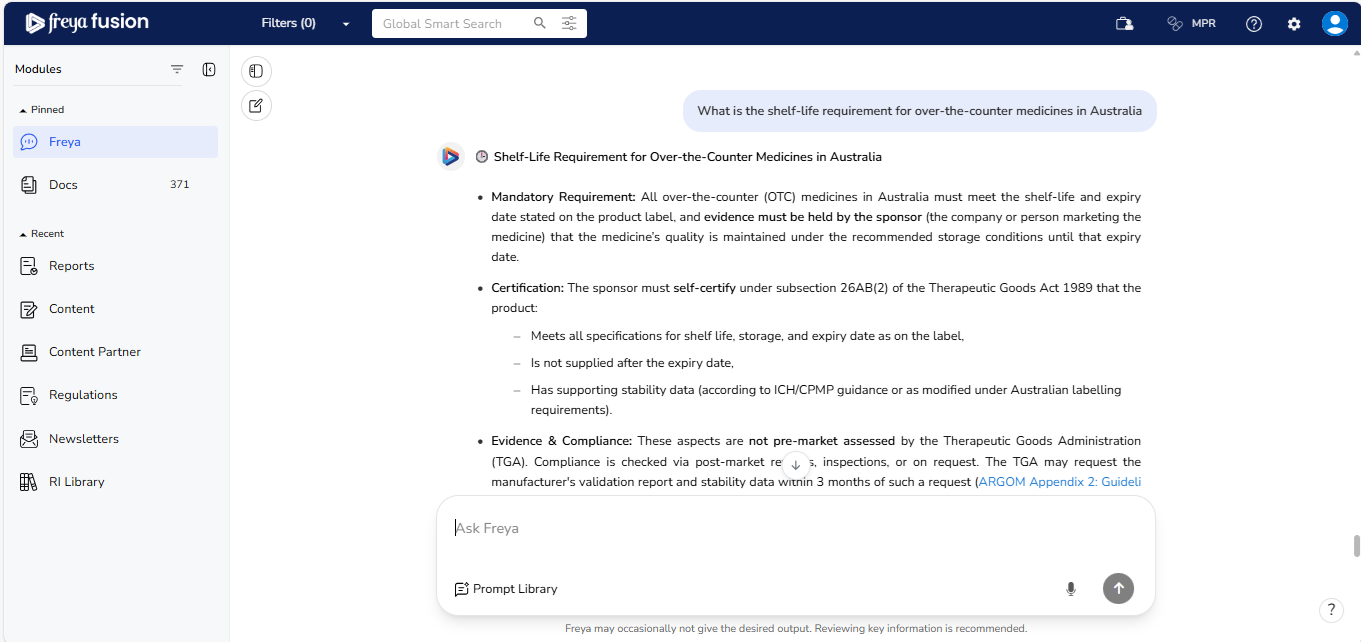 Freya is built to maintain the context of your conversation, allowing for a smooth, natural flow; just like speaking with a regulatory expert. You don’t need to repeat or rephrase your earlier question. Simply ask your follow-up, and Freya will understand the reference and respond accordingly.