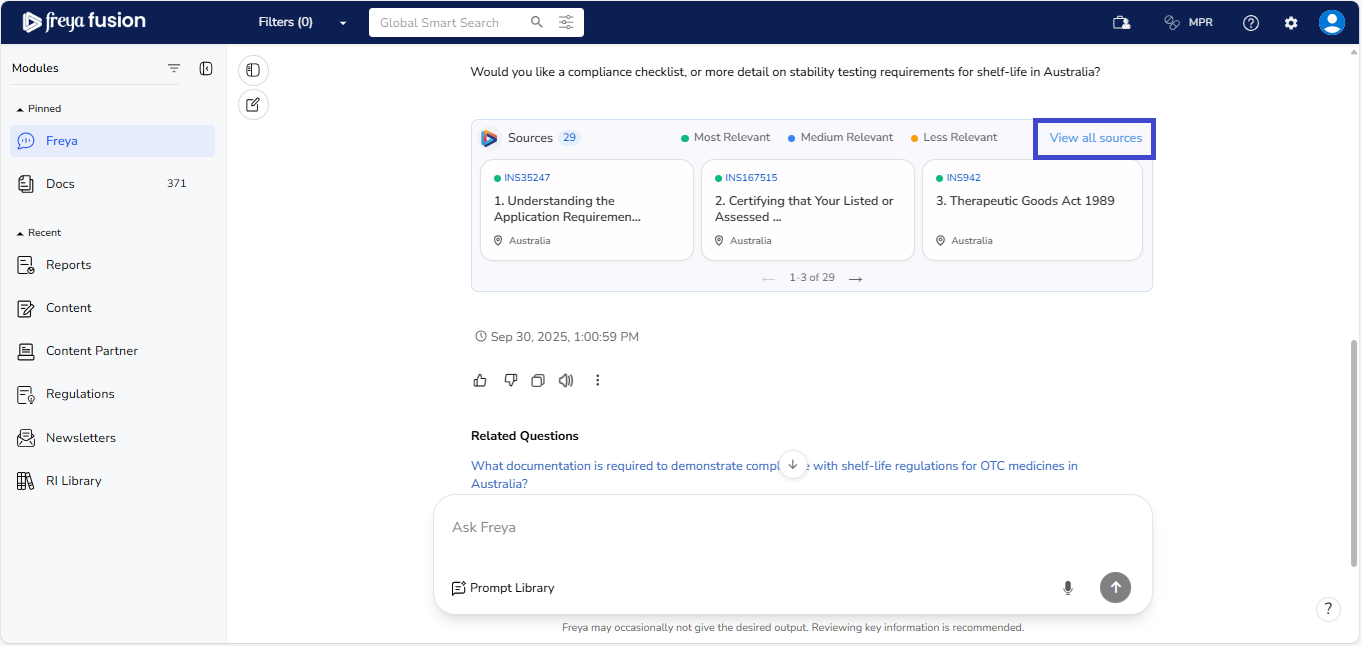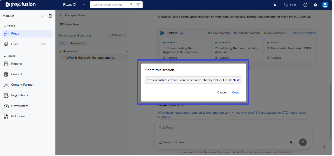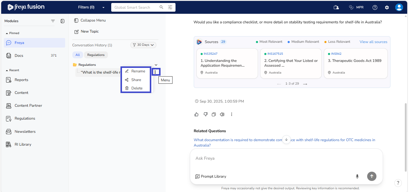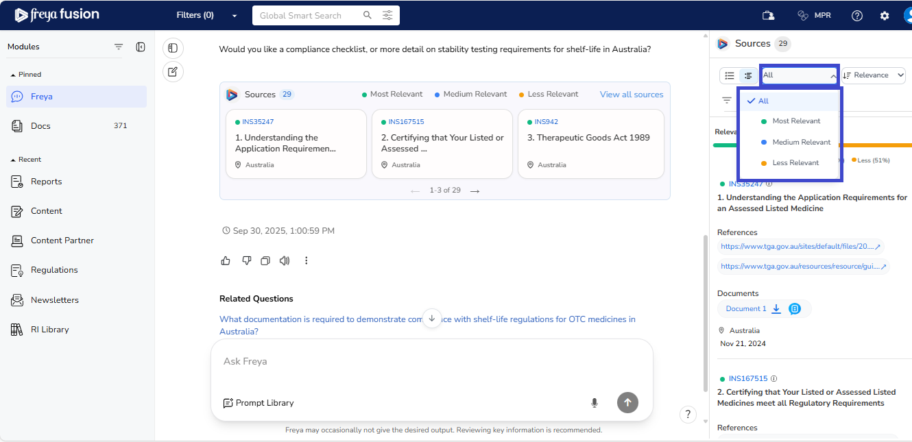 Freya is built to maintain the context of your conversation, allowing for a smooth, natural flow; just like speaking with a regulatory expert. You don’t need to repeat or rephrase your earlier question. Simply ask your follow-up, and Freya will understand the reference and respond accordingly.