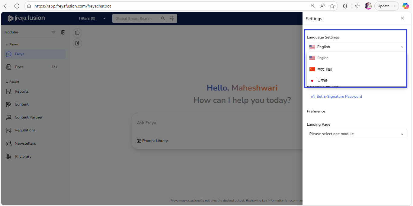 The Language Settings option allows you to change the display language you are conversing in with the chatbot. Freya Chatbot now supports Chinese (alongside Japanese), making it even more accessible. You can select from the available languages in the dropdown menu.